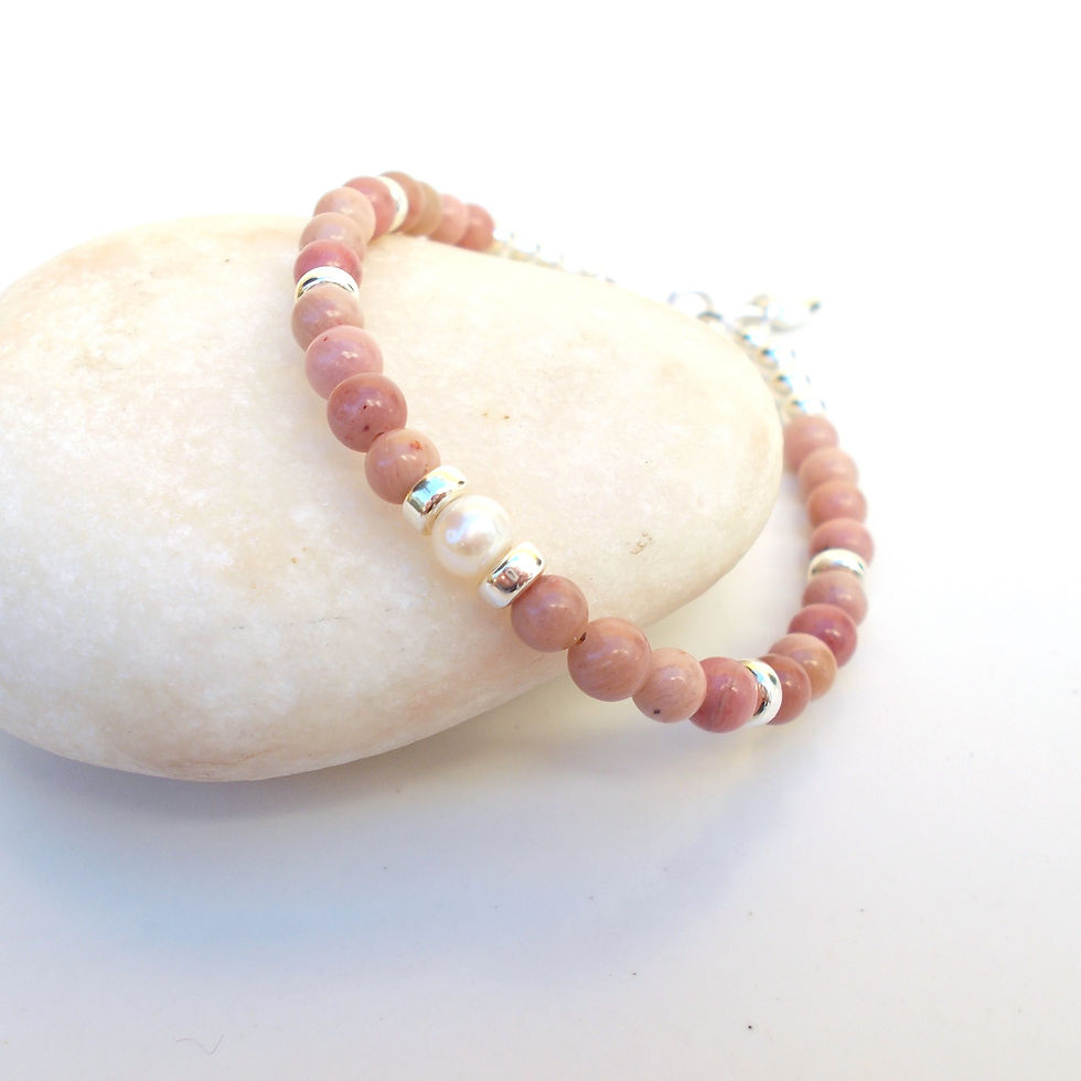Delicate Rhodonite, Pearl and Sterling Silver Bracelet, Adjustable